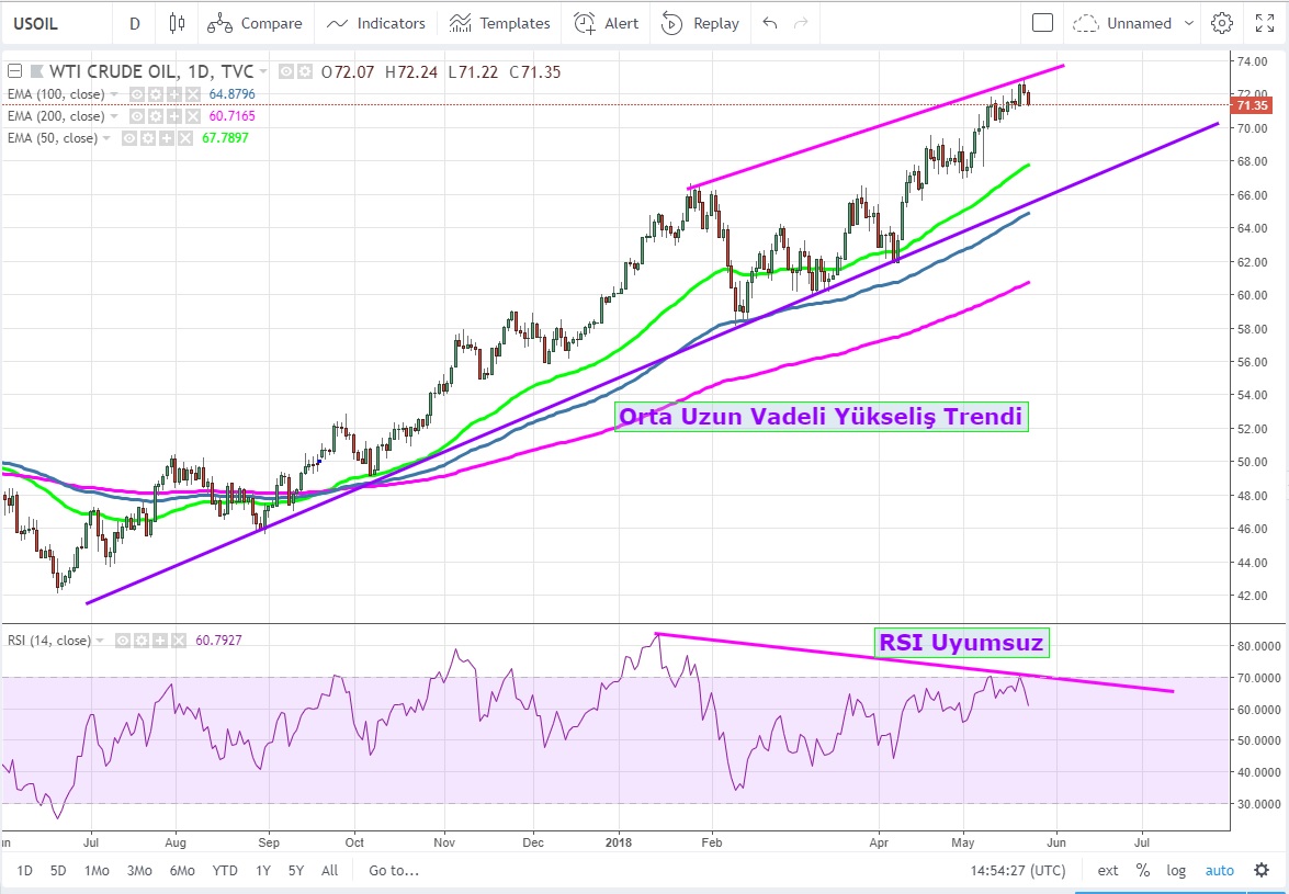 Günlük grafiklerde orta uzun vadeli yükseliş trendi korunsa da 66.65 ve 72.91 USD zirvelerindeki RSI uyumsuzluğu dikkat çekici