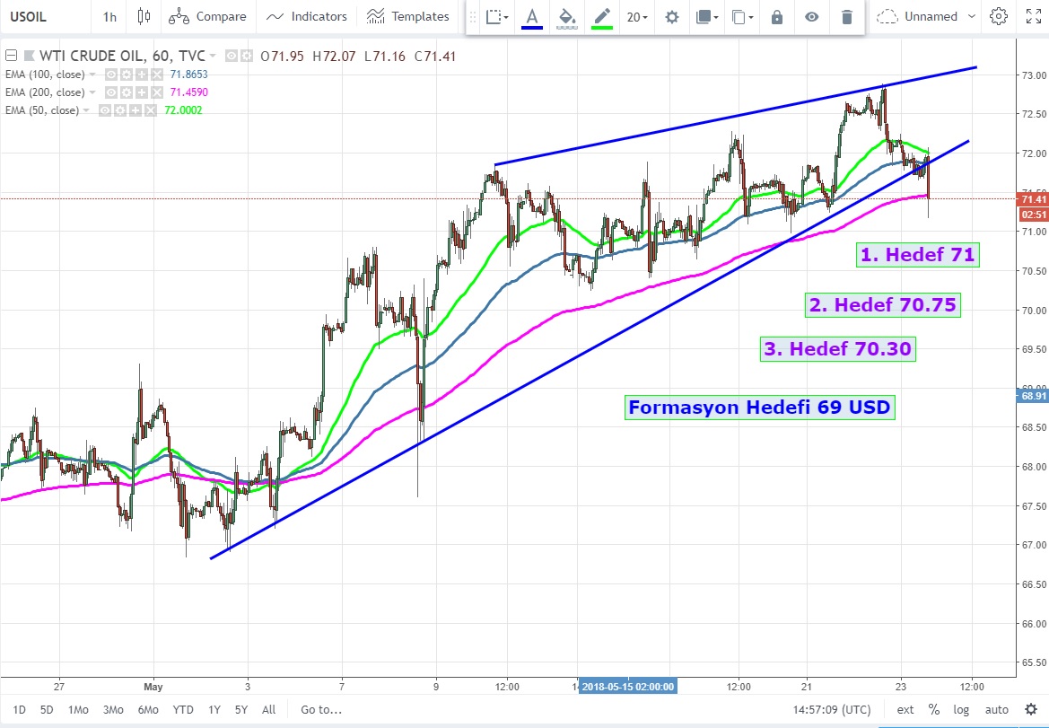 Saatlik grafiklerde ise yükseliş trendini kıran ve rising wedge oluşturan WTI Futures aktif vadlei kontratlarda 73 USD üzeri kapanış olmadığı sürece sırası ile aşağıdaki grafikte gösterdiğim seviyelerin test edilmesini beklerim