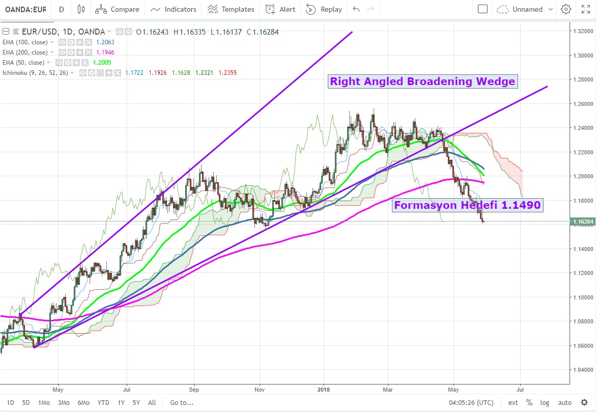 Günlük grafiklerde Right Angled Broadening Wedge oluşturan paritenin formasyon hedefi 1.1490 olarak öne çıkıyor