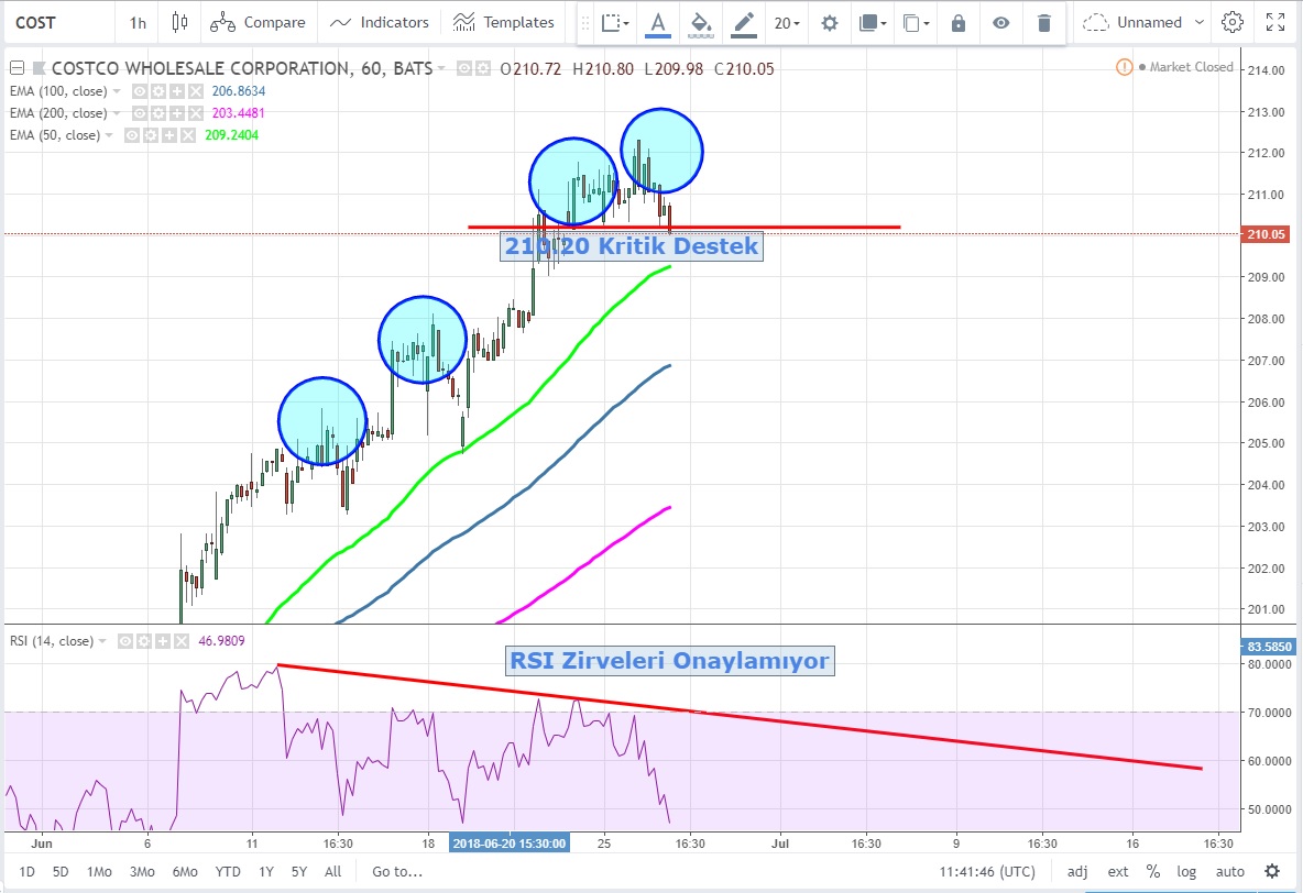 Dün kapanışını 210.05 USD seviyesinden yapan hisse senedi kısa vadeli grafiklerde uyumsuzluk göstermeye başladı