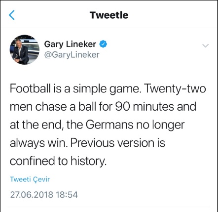 "Futbol basit bir oyun, 22 kişi 1 topun peşinden 90 dakika koşar ve Almanlar artık her zaman kazanmaz" olarak revize etti.