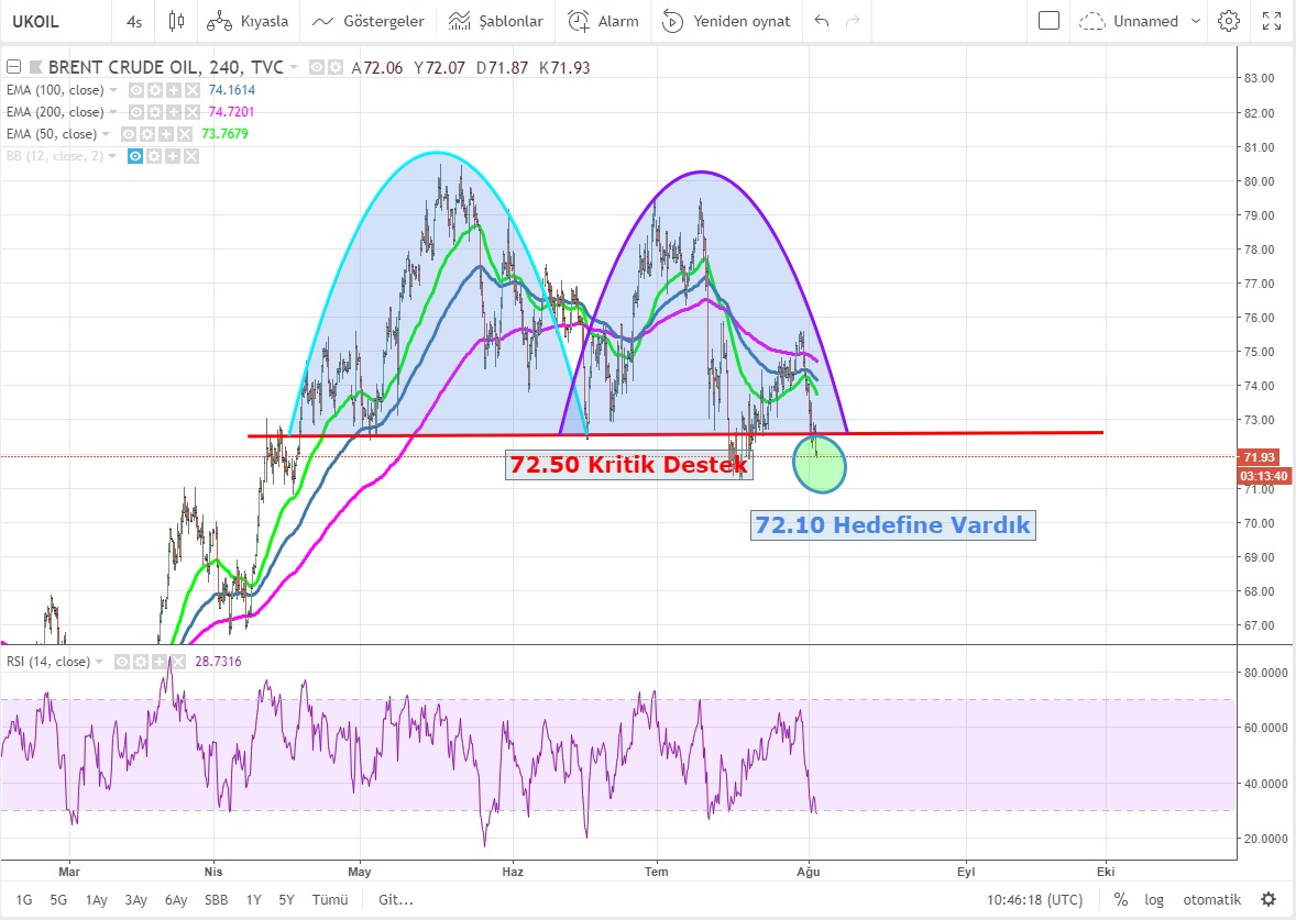Dün petrol stok verisi ile beraber 72.50 geçilmesi ile ilk hedef olan 72.10 USD hedefine vardık