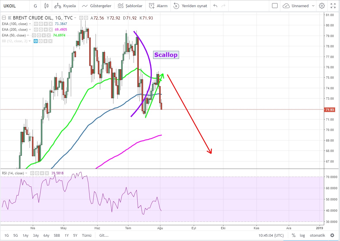 Günlük grafiklerde Scallop oluşturan Brent Eylül vadeli kontratlarında 71.20 desteği kırıldığında satışlar hızlanacaktır