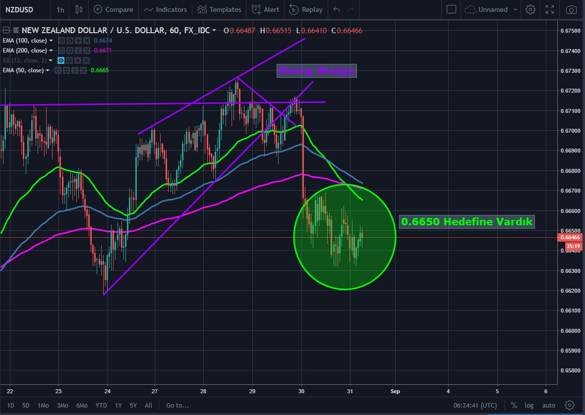 NZDUSD futures Eylül vadeli kontratlarda kısa vade için konuştuğummuz Rising Wedge hedefine varılırken