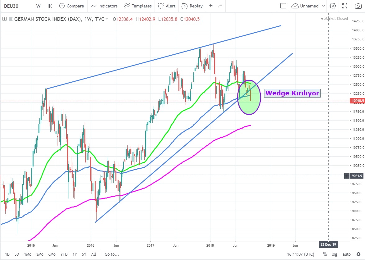 Haftalık grafiklerde rising wedge'yi kırmaya hazırlanan endeks 12320 altında haftayı kapatırsa formasyon çalışmaya başlayacak