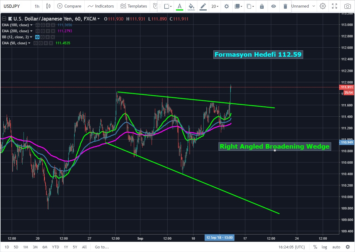 An itibari ile 111.92 seviyesinden fiyatlanan parite kısa vadede ise Right Angled Broadening Wedge oluşturdu