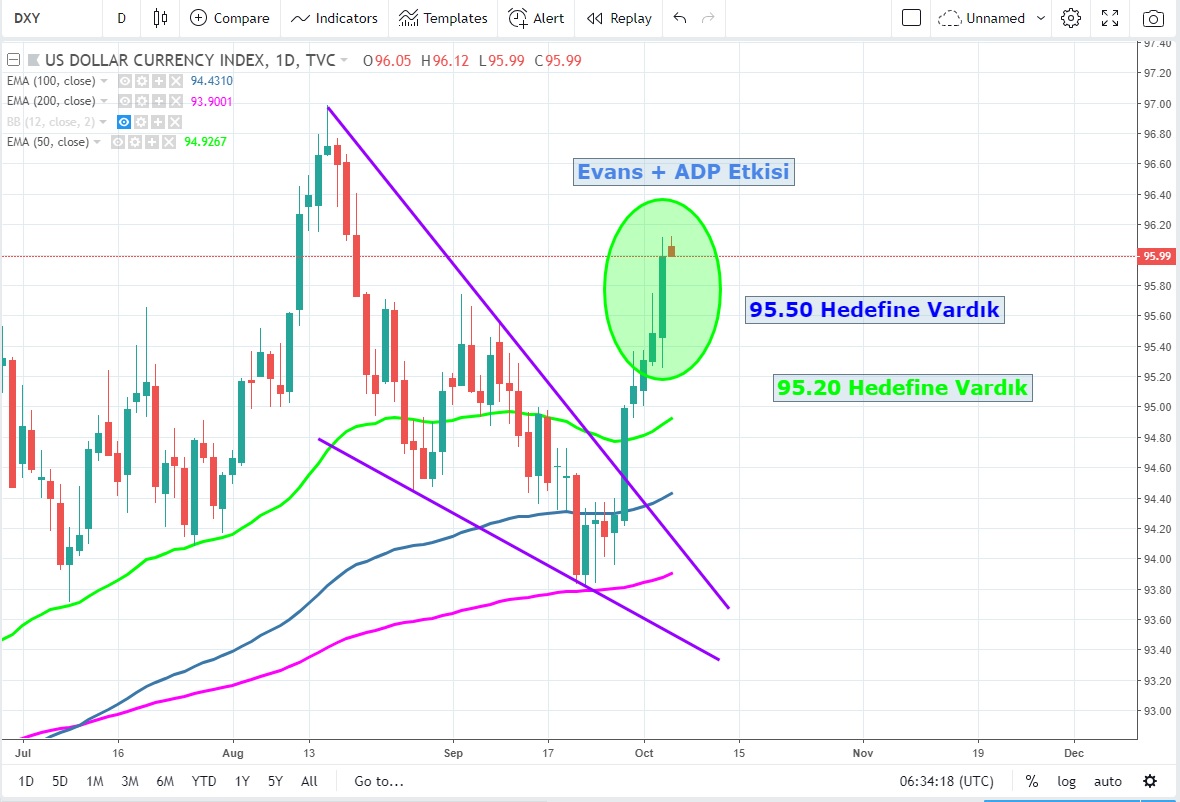 ve akşam saatlerinde FED başkanlarından Evans'ın "bu yıl içerisinde 4. faiz arttırımı konusunda" çok rahatım açıklaması ile kuvvetlenen dolar endeksi 96.12 yükseğini gördü