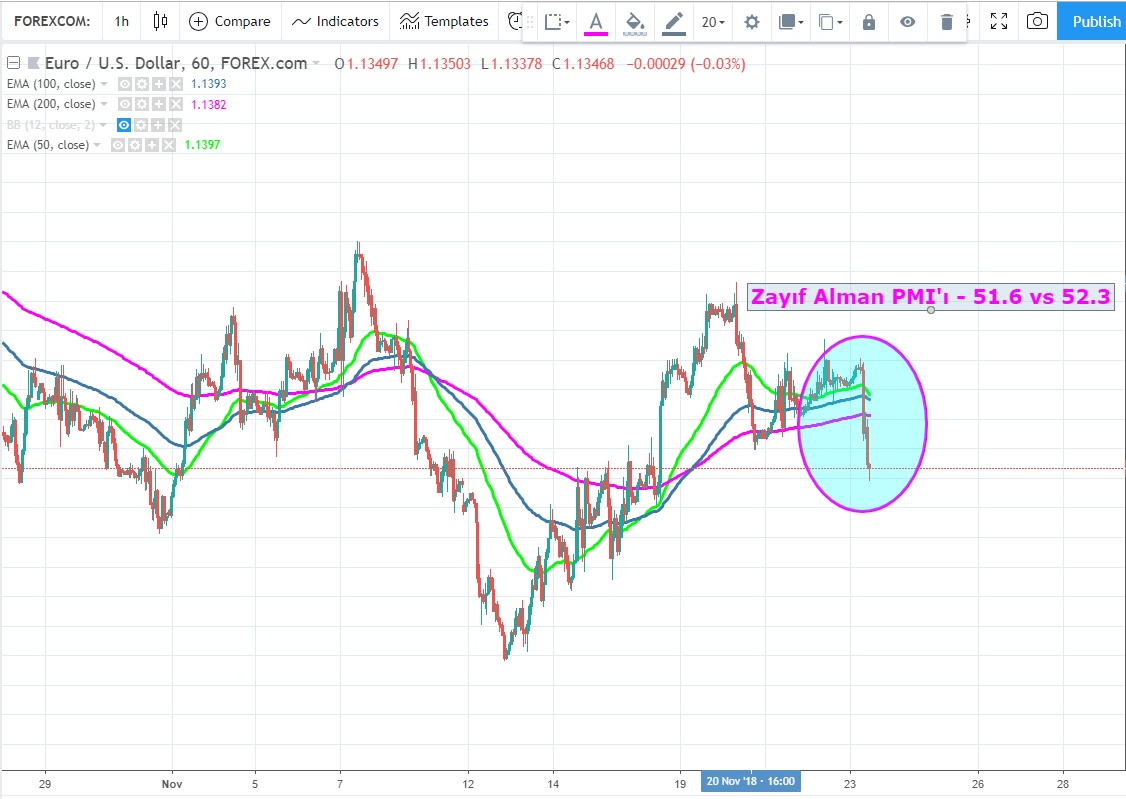 TSİ 11:30'da beklentilerin altında gelen Almanya PMI verisi (Açıklanan 51.6 vs Piyasa Beklentisi 52.3) paritede satışları hızlandırırken ileriye yönelik büyüme beklentileri için de zayıflık göstermeye devam etti