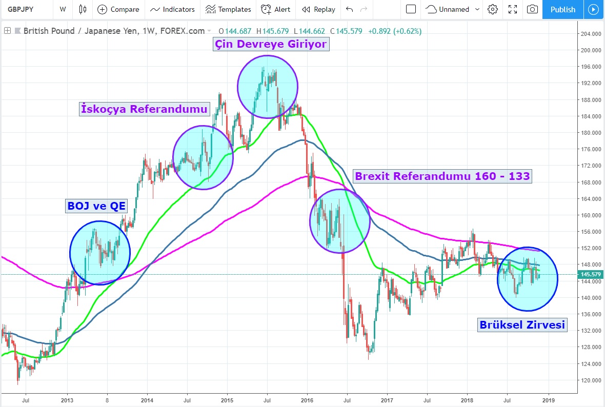 Aylık grafiklerde tarihsel olarak yaşanan etkiler dikkat çekici. Brexit'in yarattığı siyasi belirsizlik 2016 Haziran ayında 160 seviyelerinden 133'e kadar uzanan bir düşüşü tetikledi.
