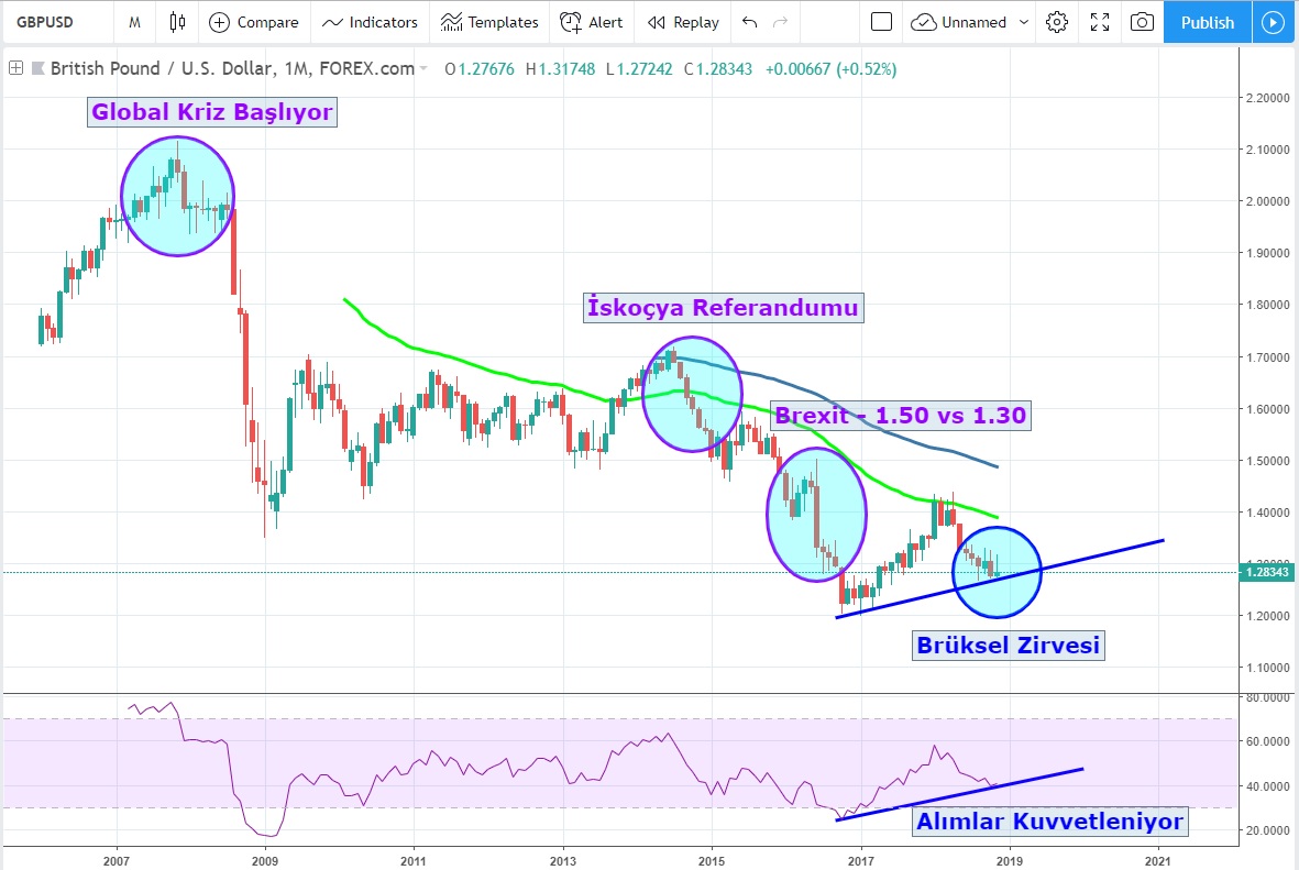 2008 krizinden beri İskoçya referandumu ve Brexit gibi iki önemli politik gelişme yaşayan Sterlin'deki büyük düşüş tarihsel olarak şu şekilde