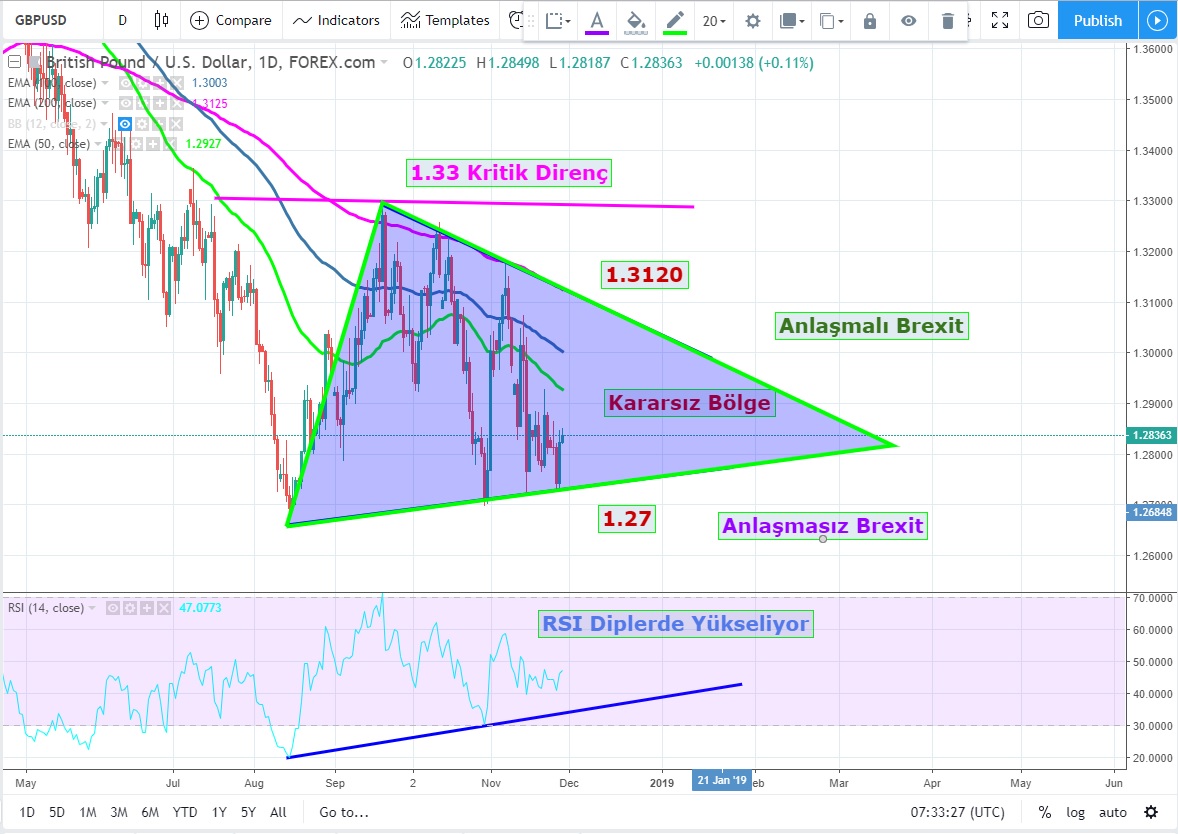 Günlük grafiklere indiğimizde ise yaşanan belirsizlik paritenin 1.27 ve 1.3120 arasında sıkışmasına neden oluyor