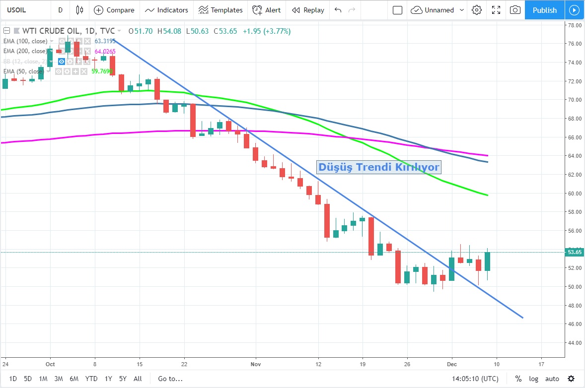 - Piyasa bu sonucu beğenmişe benzer. Ancak İran – SA çekişmesinde gerçek durumu henüz göremedim. Yine de bu karardan dönüş olmayacaktır. Piyasa büyük olasılıkla pozitif fiyatlamaya devam eder, WTI da $50 bölgesinde bir taban oluşmuş olabilir. Aşağıda gün içi grafiği birkaç gün için sıkıştırarak paylaşıyorum.