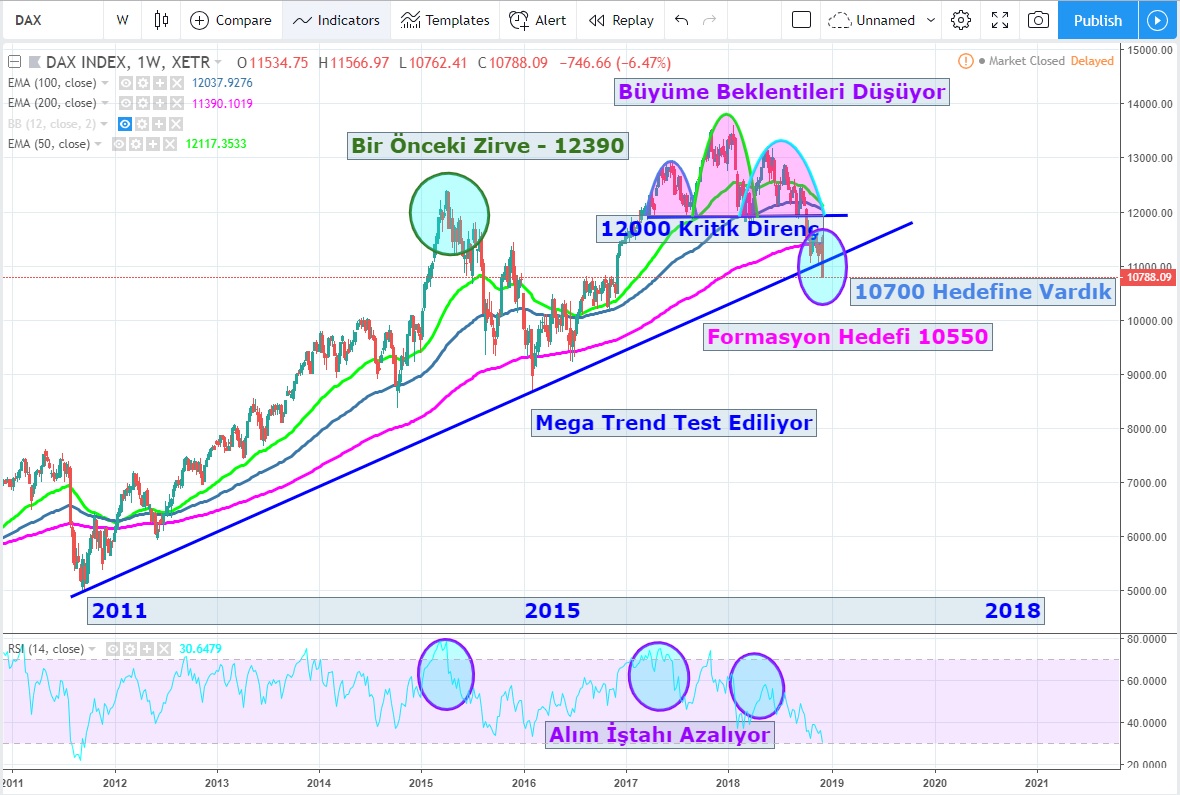 Haftalık grafiklerde mega trendini kıran DAX aktif vadelileri 11570 altında kaldığı sürece satış baskısıyla karşılaşmaya devam edecektir