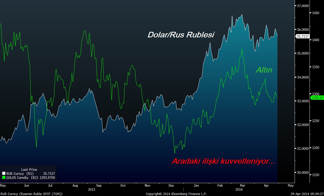 Son zamanlarda yaşanan altın hareketinin öenmli kısmını Rusya-Ukrayna gerginliğine atfetmiştik. Diğer sebepleri de sıralamakla birlikte aslan payını Putin'e vermiştik. Aşağıdaki grafikte USD/Ruble ve altın arasındaki korelasyonunun kuvvetlendiğini görmek mümkün. Fiyatlar benzer hareketler yapıyorlar ve ruble için iyi olan barış umutları ya da hafif yaptırımlar gibi haberler altına hemen satış olarak yansıyor. Tabii ki tam tersini de söylemek mümkün.
