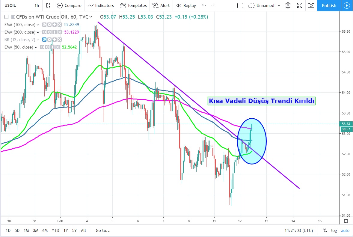Saatlik grafiklere indiğimizde ise 52.50 USD üzerinde kaldığı sürece