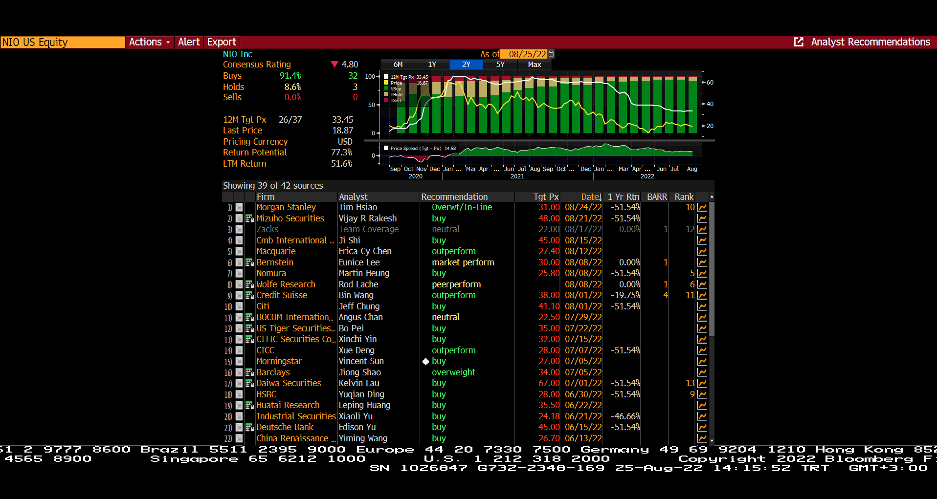 Analistlerin Nio için hedef fiyatları (Bloomberg):