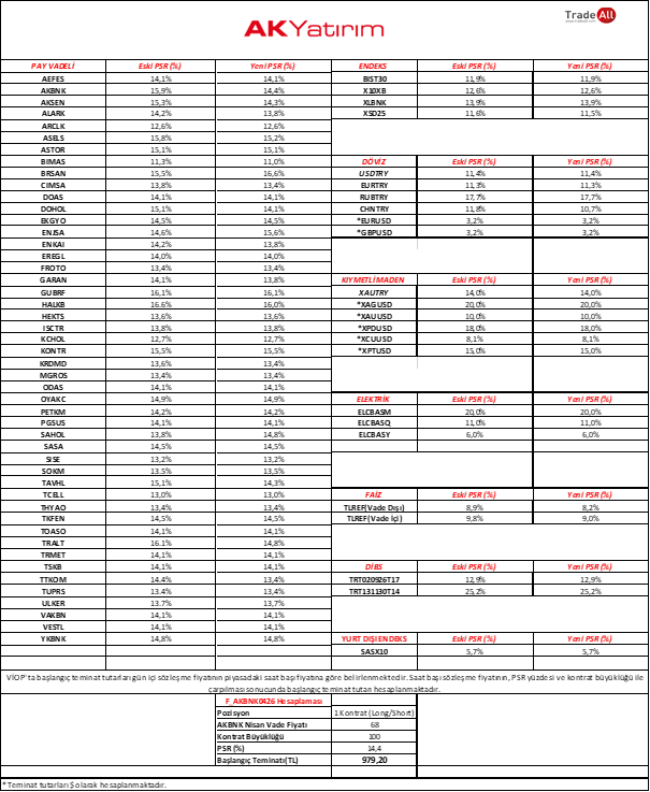 VİOP Span parametreleri 01.04.2026 Çarşamba günü, gün içi ilk risk hesaplama anından itibaren geçerli olacak şekilde güncellenecektir. Güncel parametreler aşağıdaki tabloda yer almaktadır. İlgili Takasbank duyurusu için tıklayınız.
