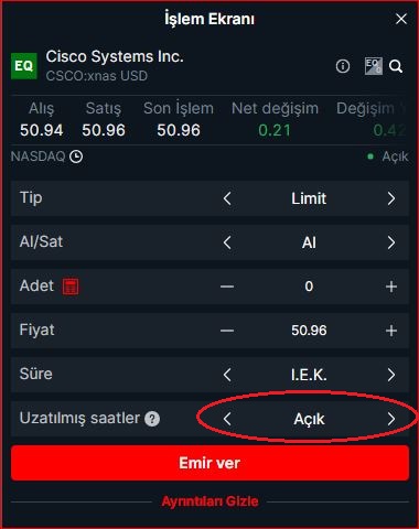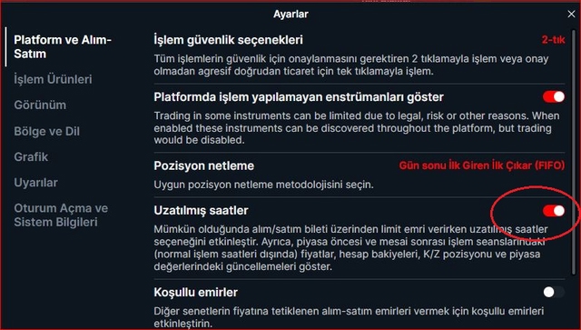 2. “Platform ve Alım/Satım” ayarlarından uzatılmış saatler etkinleştirilir.